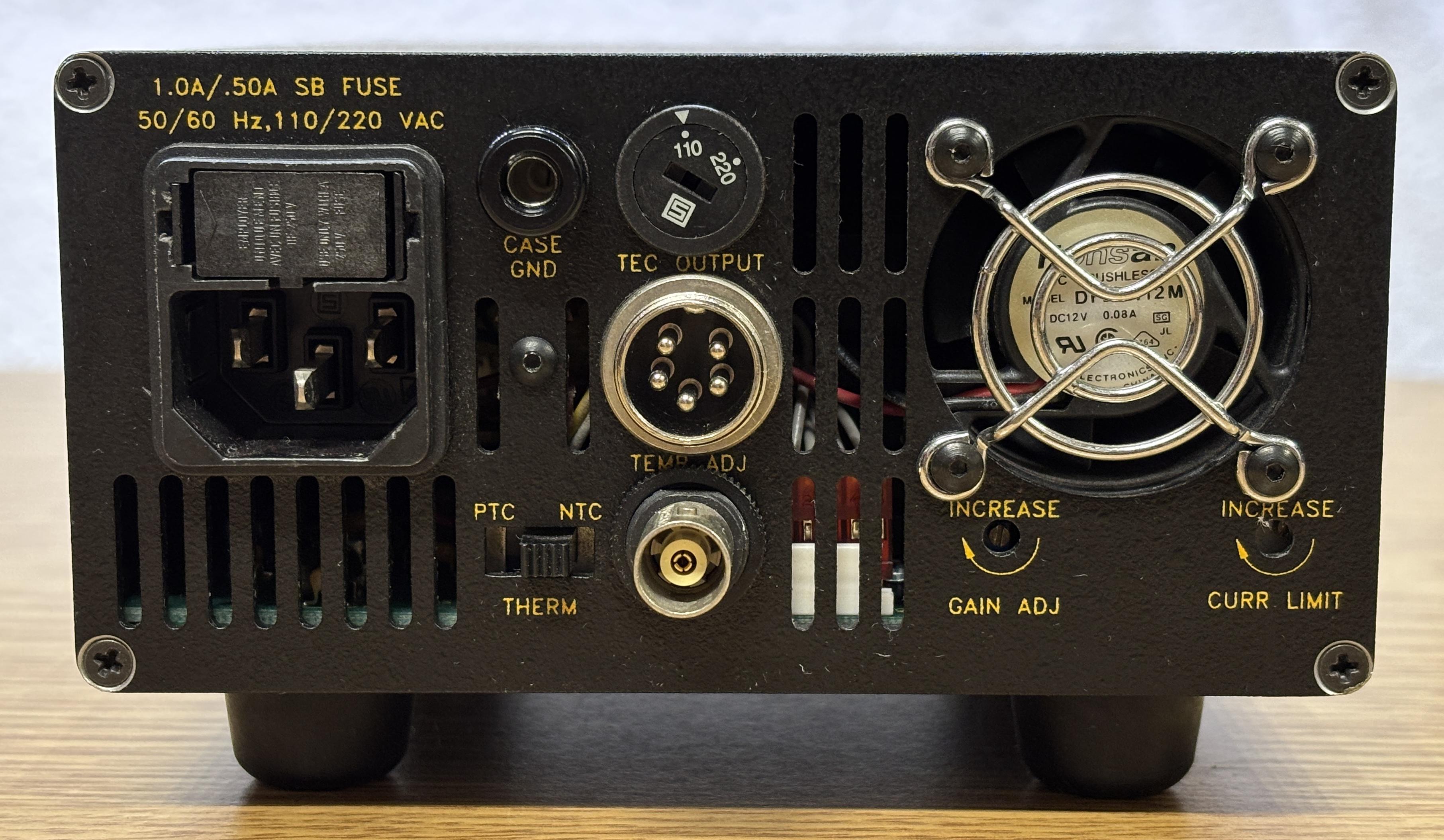 On the front of the unit is a large digital display that shows various measurements depending on the position of the selector switch. A power switch in the lower-left corner isolates AC power from the unit. After that is a rotary selector switch which changes the display readout and signal produced from the OUTPUT BNC terminal. It has the following selections: set temperature, current temperature, TEC current (I), and current limit. After that is a 10-turn potentiometer for adjusting the temperature setpoint. The last control is for the thermistor type, which has the following selections: THERM LOW, THERM (normal), LM355, and AD592. The OUTPUT BNC connector is for monitoring and data logging as it outputs the currently displayed value as a voltage (0-9 VDC). The rotary selector that changes what is displayed on the built-in screen also changes which data point is output from the BNC. On the top right corner is the COOLER ON button and accompanying status light, this allows the operator to disable the TEC without needing to shut the whole unit off. The thermistor readout remains active even when the TEC is off.