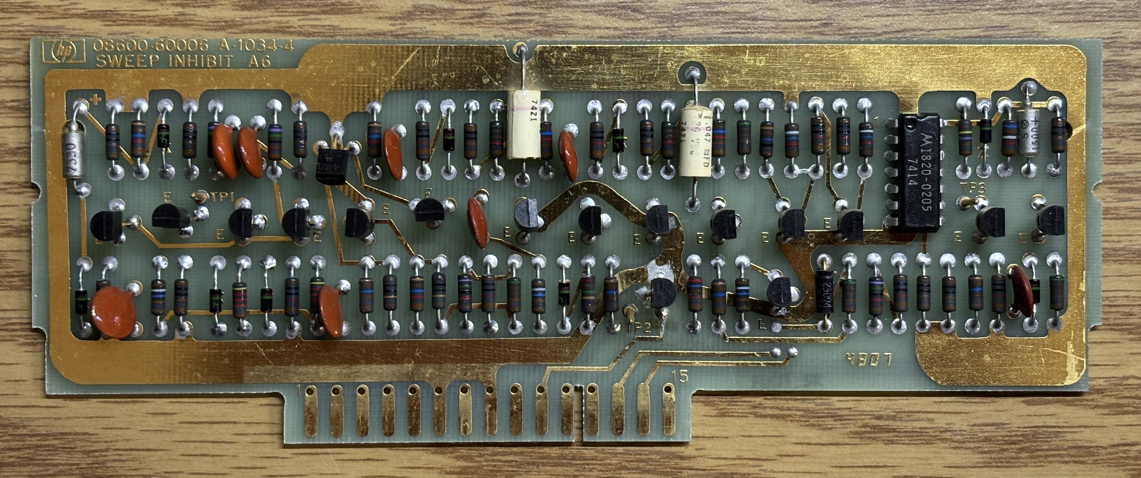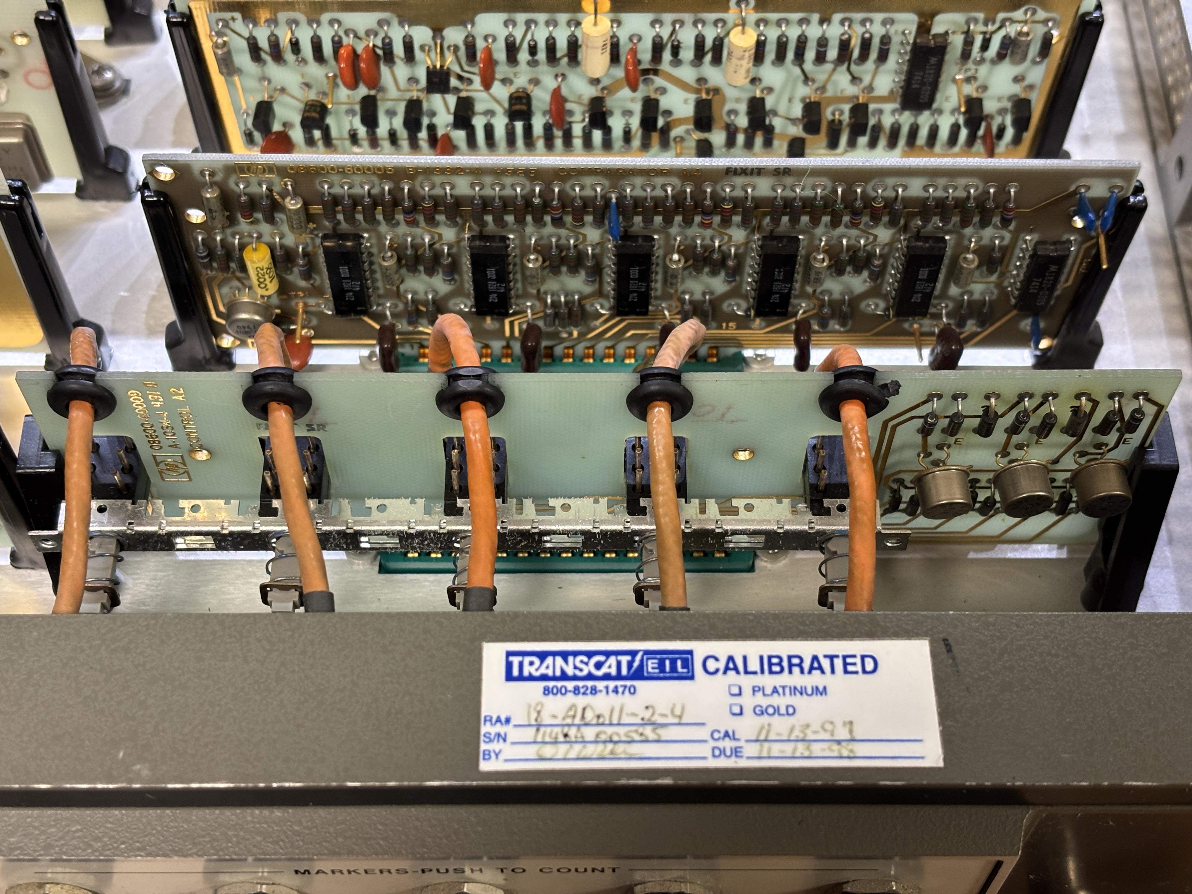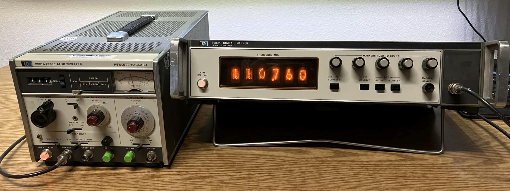 The 8600A digital marker is part of the spectrum and network analyzer family of HP products from the 1960s and 70s. It was designed to be used with the 8601A generator/sweeper and is normally connected to the AUX output of the sweeper. The digital marker provides a precise readout of the frequency currently being analyzed, without the need to estimate the frequency using the sweep dial or graticule. It also generates marker tones that can then be displayed as sharp peaks on the analyzer's display. The 8600A contains some primitive digital logic combined with analog RF circuitry that is spread out across several cards installed in a backplane. It uses an internal oscillator and a series of dividers and counters to generate the marker tones, which essentially form an accurate ruler on the analyzer's display. The rotary encoders are used to adjust the marker spacing. Nixie tubes are used to display the numbers that make up the frequency readout.