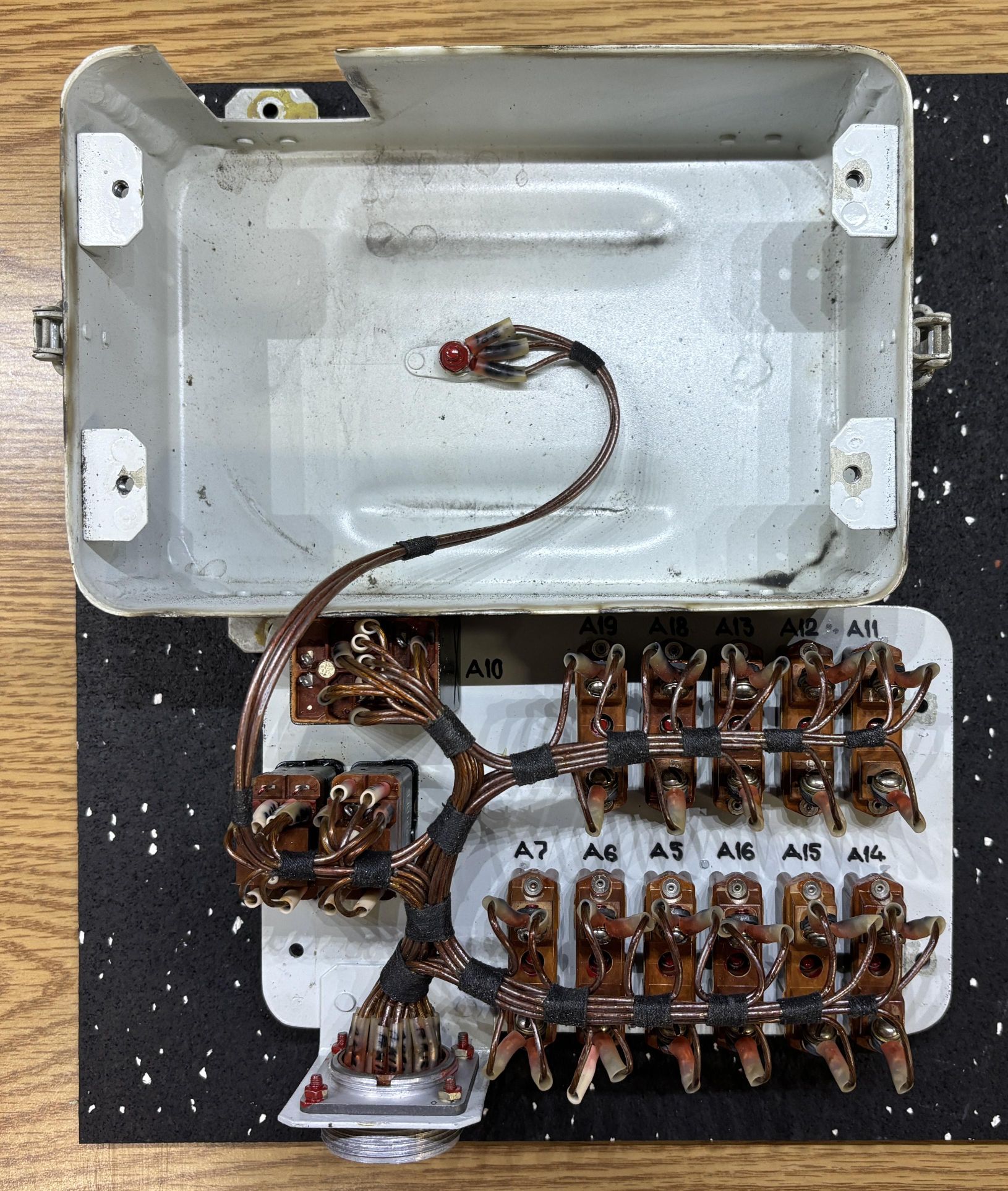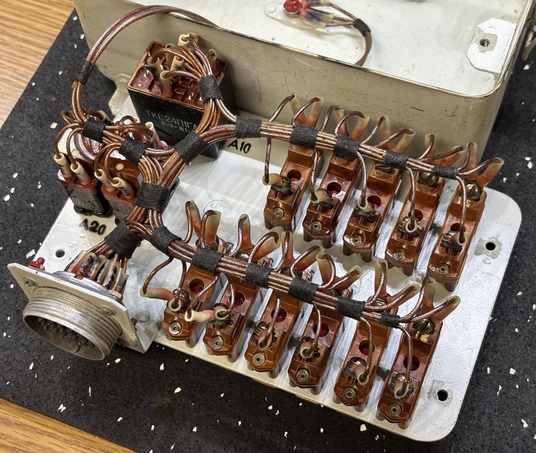 This is the fuse box from the Yak-18T. It's an aluminum enclosure packed full of genuine soviet fuses, relays, and wiring on the inside. These fuses protect the avionics and electronic instruments from further damage if they malfunction or if there is a wiring problem. It's important to note that these fuses cannot be reset when they blow, and must be replaced. Modern aircraft generally use circuit breakers that can be reset if needed.