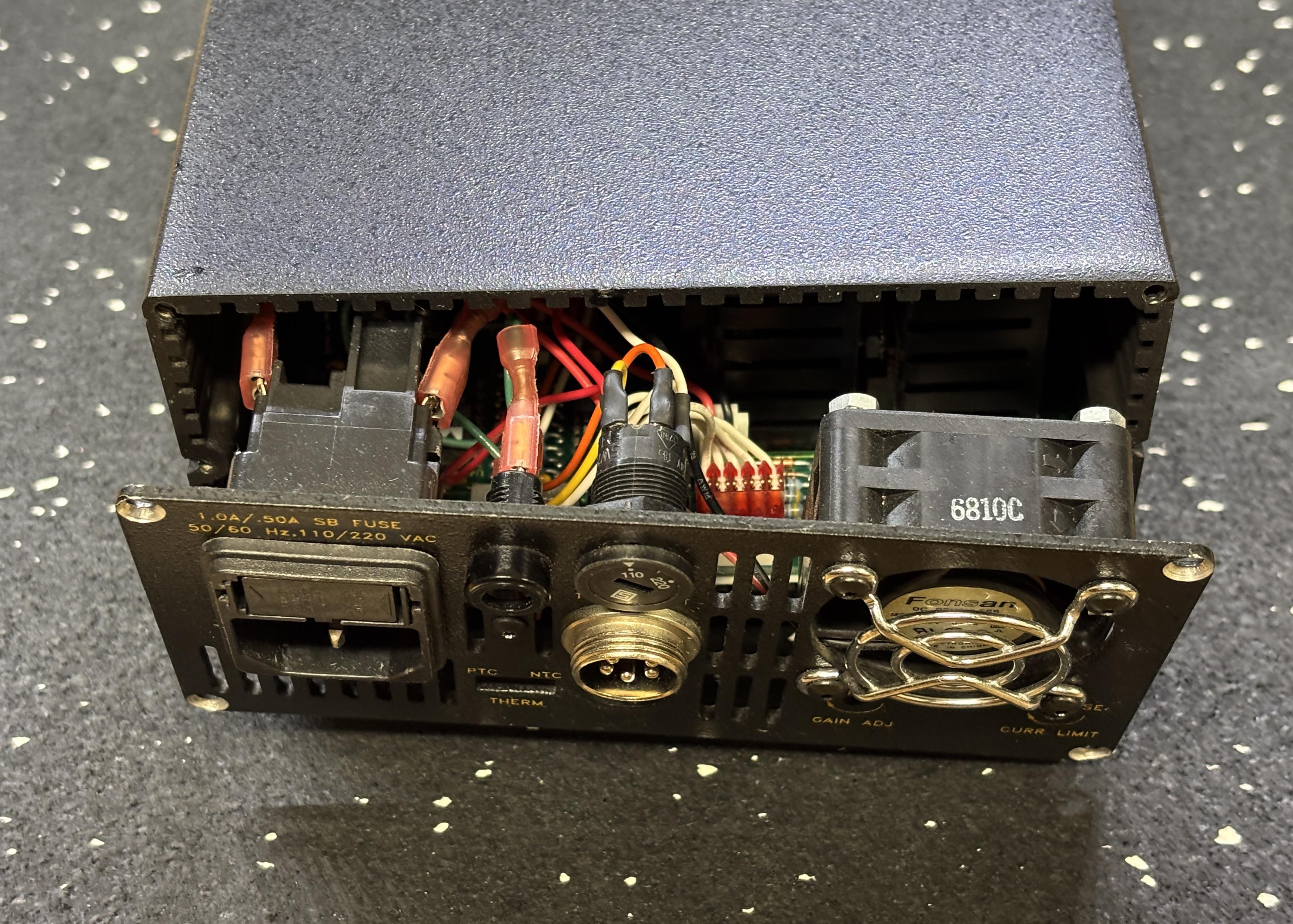 On the back are the majority of the connections along with some additional controls. There is a standard IEC power input with a fuse, and a separate selector switch for 120/240 VAC operation. There is a small cooling fan that we plan to replace as it sounds like the bearings are failing. There is a banana jack which is tied directly to the case ground, useful in ESD sensitive environments. The male 5-pin connector is for connecting the actual TEC and thermistor. We were unable to locate a pin-out for this connector anywhere, so we figured it out ourselves and provided a table below for reference. The TEMP ADJ BNC is for externally controlling the temperature setpoint. A two-position switch is used to select between PTC and NTC thermistor types. Lastly there are two small potentiometers recessed into the case that are used to adjust the thermistor gain and TEC current limit. In this particular unit, the current limit potentiometer was bent off to the side making the adjustment screw inaccessible from the hole. This was easy to fix as we just opened up the unit and bent the potentiometer back into place.
