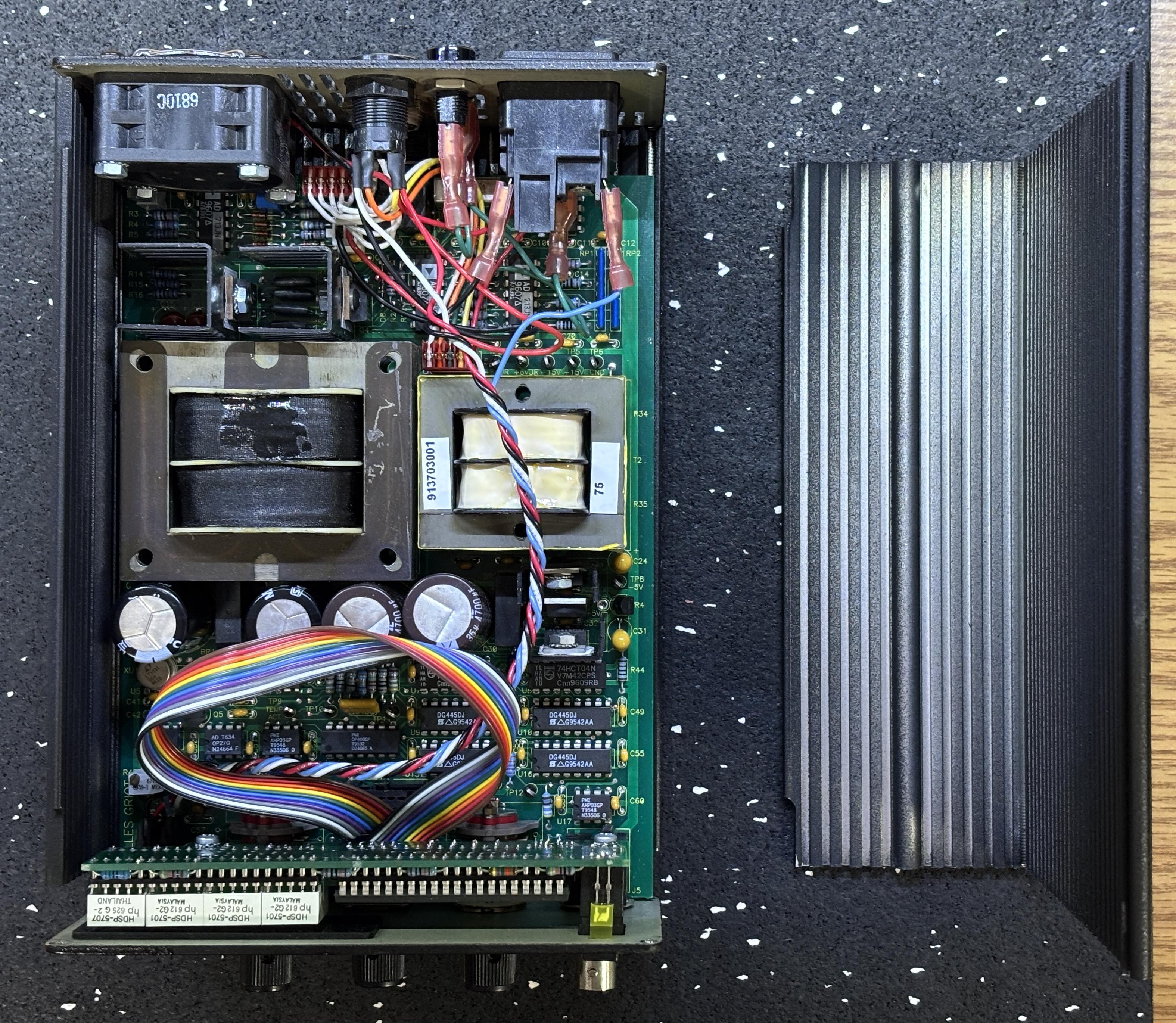 There is not much length on the wires, but it can be shifted down and to the right to allow the top section of the metal enclosure to slide off towards the back, revealing the internal components.