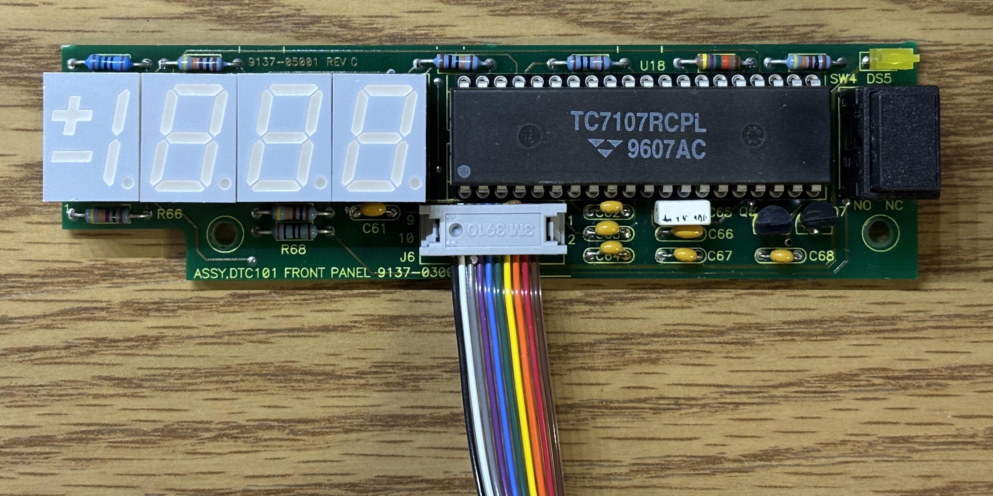 This is the display board that also includes the COOLER ON button. It mounts to the back of the front panel via some standoffs and connects to the motherboard via a ribbon cable. There's not much to see on this board other than the 7-segment displays and a TC7107RCPL 3.5 digit analog-to-digital converter which is used to drive the displays.