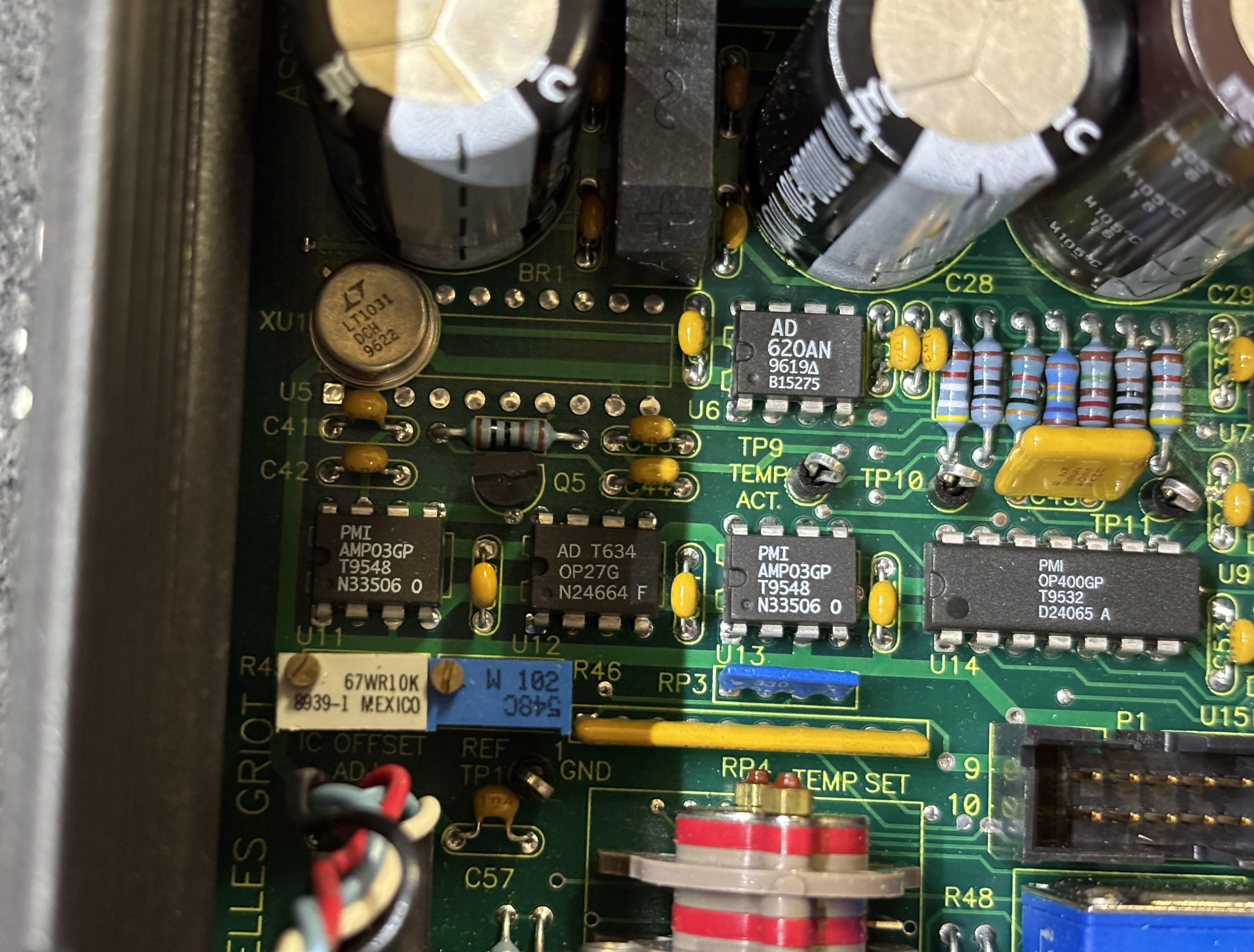 Located towards the center of the board are two chunky transformers and some capacitors. The board is very cleanly laid out and features all through-hole components. It appears to just be a two layer board (front and back) and is about what you'd expect from the late 90s. Various types of operational/precision amplifiers, 74HC-series logic, analog switches, and transistors for driving the TEC all reflect a simple analog design. Luckily, all the components are clearly labeled and quite common. Repairs should be easy on this unit, especially since there is no central MCU or processor.