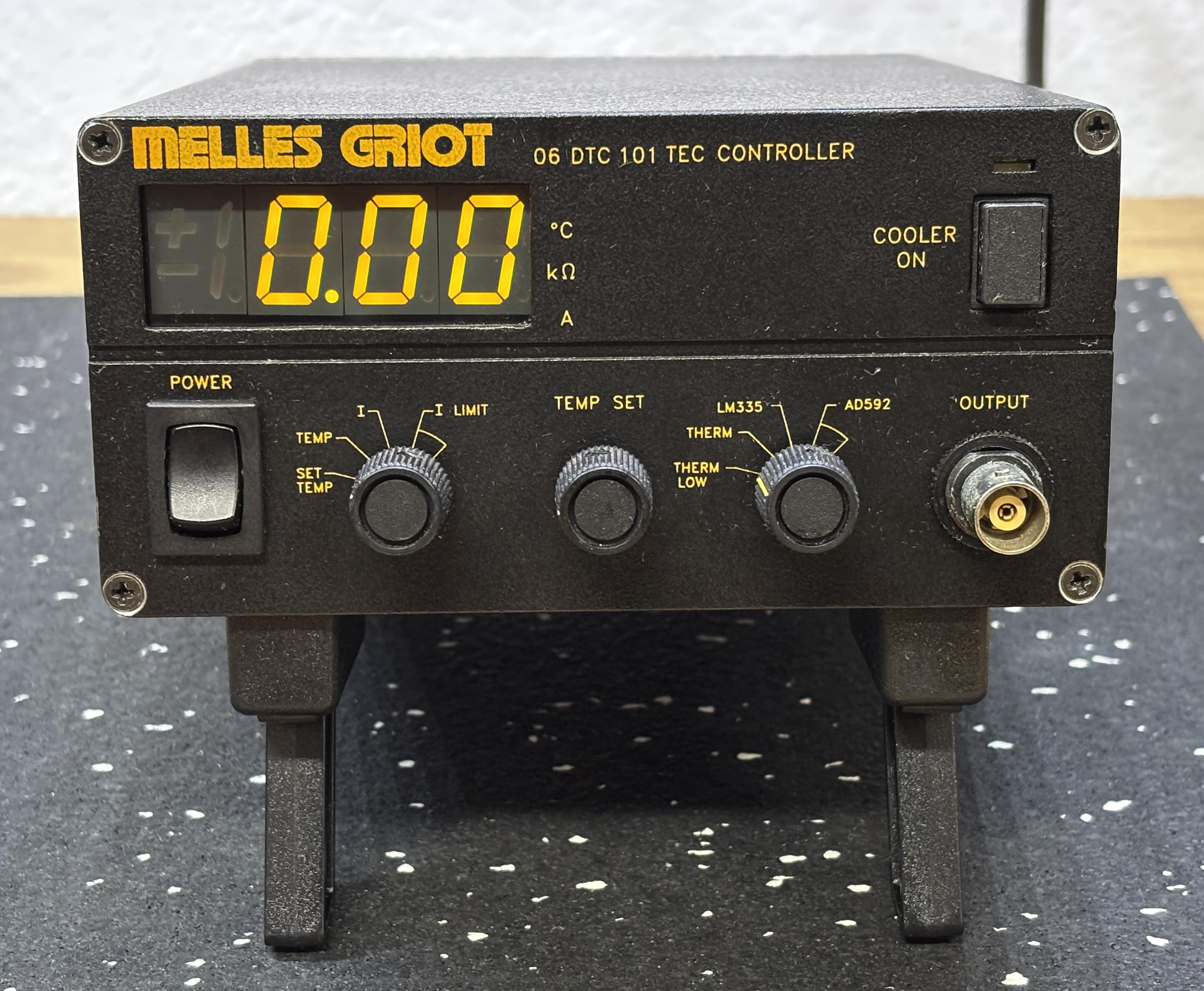 The 06-DTC-101 is an external TEC driver manufactured by Melles Griot. The device was intended to drive TECs of various specifications in lab settings. The system supports various types of thermistors which are used to monitor the temperature and control the TEC based on a user-configurable temperature setpoint. A digital readout enables the user to monitor parameters such as temperature, setpoint, TEC current and current limits. Example use cases include regulating TECs for laser systems or optics that require precise thermal management.