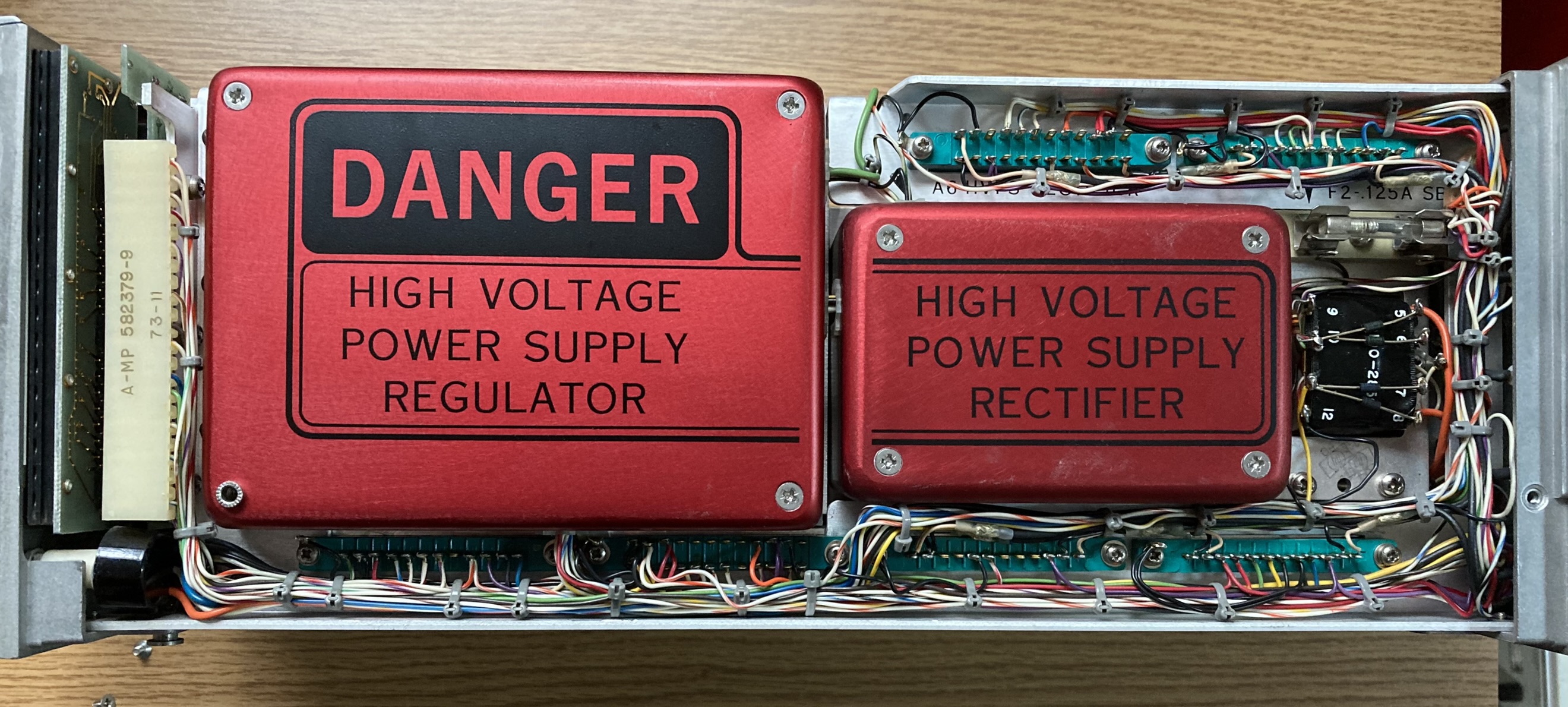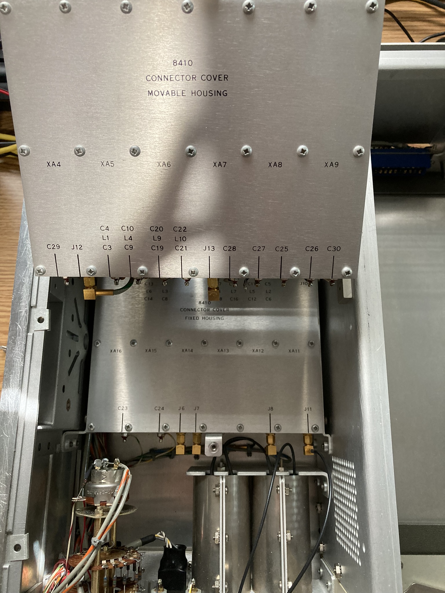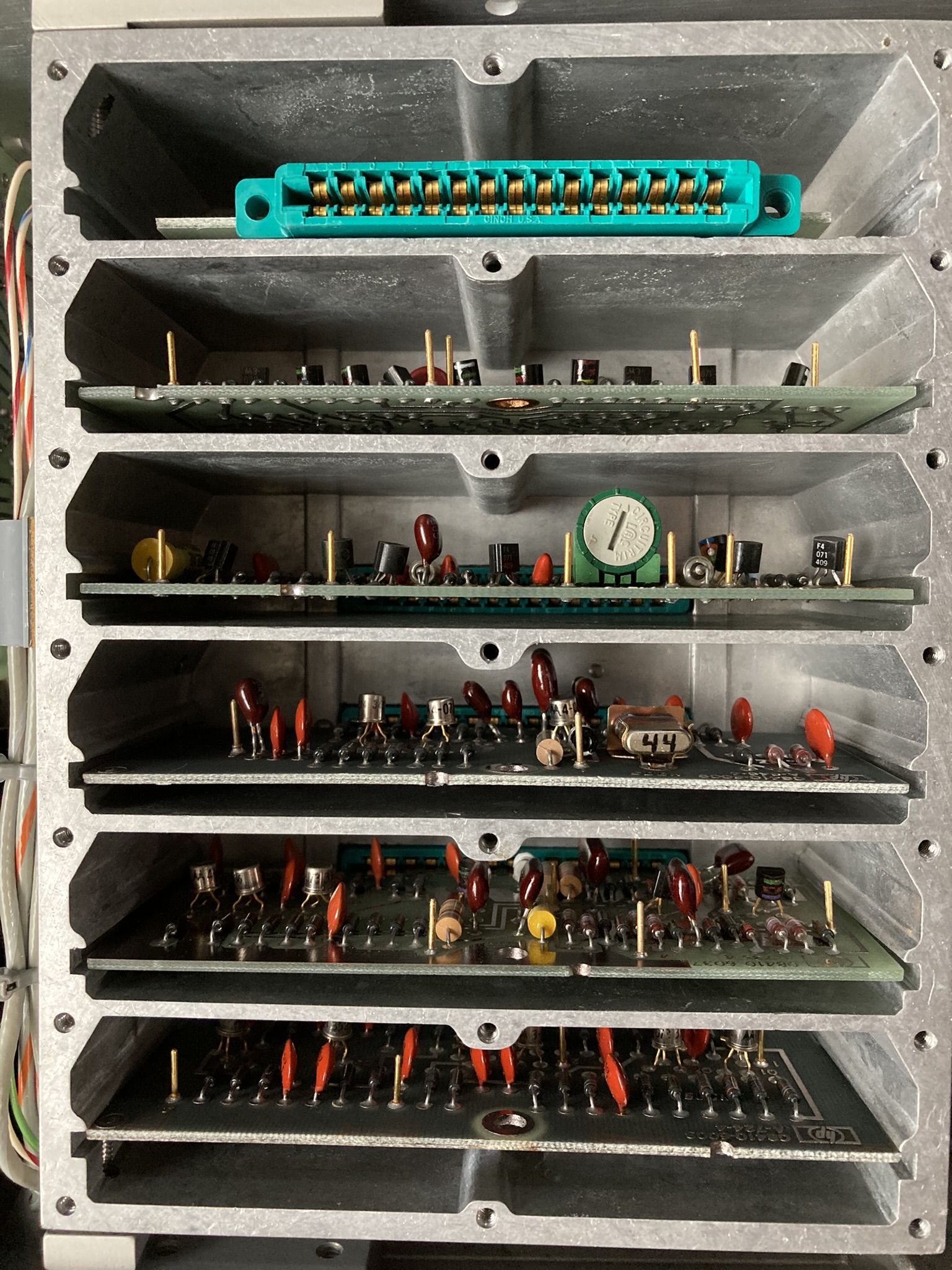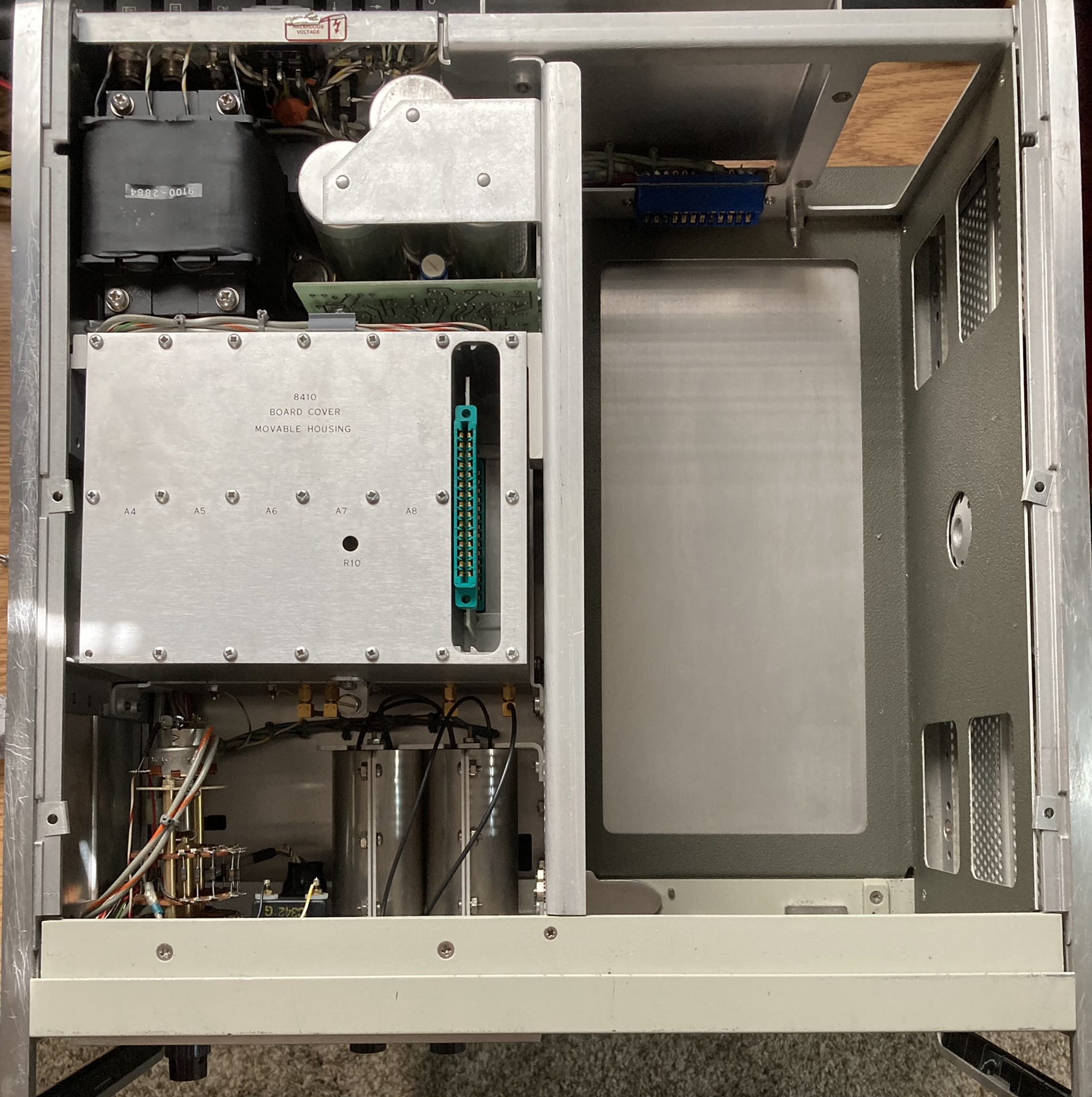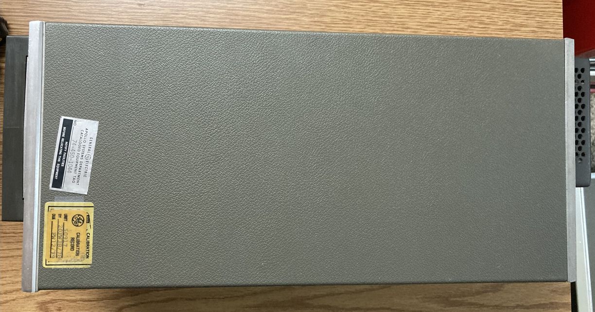 The HP 8410A is an early network analyzer from the late 60s and is one of several components of a system used to measure parameters of RF networks. The 8410A serves as the core processing and measurement unit of the system and includes a swappable CRT-based display module (8412A currently installed). The most interesting part of this particular unit are the two GE Aerospace / Apollo Systems Department asset tags located on the top of the 8412A phase-magnitude display.