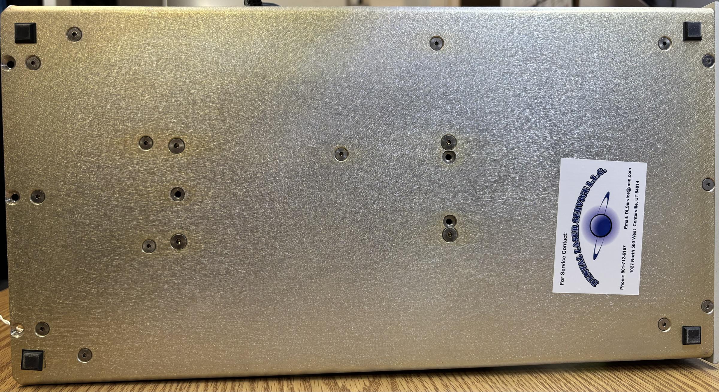 The bottom of the system is pretty unassuming. To remove the top cover, you only need to remove the three hex screws on the bottom that are closest to the front, and the four hex screws on the back (not including the fan grille). The Dental Laser Service, LLC. sticker is neat. They are probably the ones who performed the modifications that we'll discuss later.
