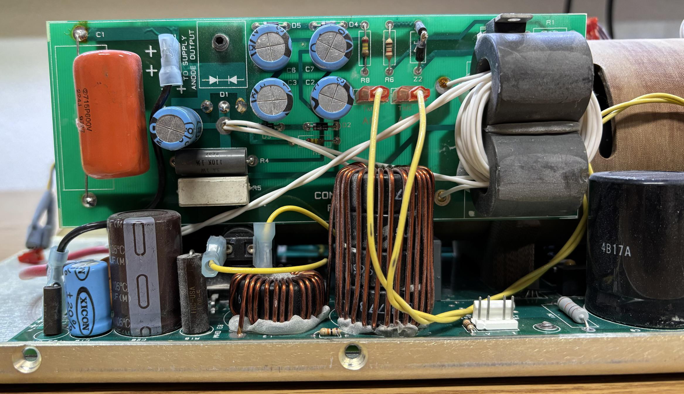 Removing the ion tube assembly is quite a challenge, but doable. Removing two pins from the front heatsink will allow it to separate and release the front section of the tube. You will also need to loosen or remove the back panel to allow room for the back of the tube enclosure to lift out. Once removed it can be placed off to the side, revealing the bottom circuit board. This is the actual tube driver board that contains most of the electronics required for providing stable power to the ion tube.