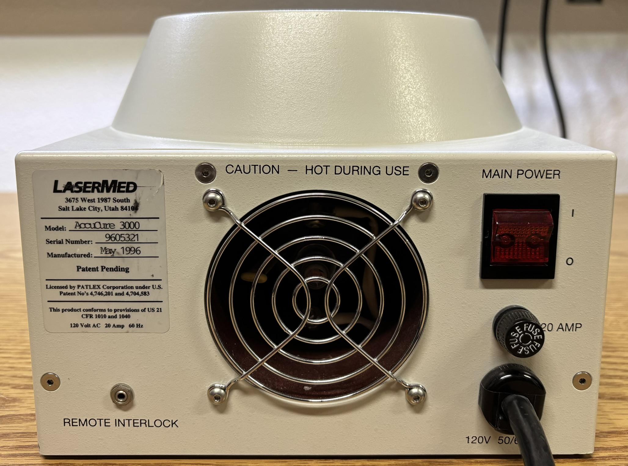 The LaserMed AccuCure 3000 is a self-contained, air-cooled argon ion laser tube and power supply all in one compact unit. It was originally intended for the curing of dental adhesives (photopolymers) and was sold as a competitive alternative to traditional lamp-based curing systems. There is very little information available online about this unit and LaserMed either went out of business or was bought out many years ago. Also, modern dental curing is done by LED-based UV lighting or just with LEDs in general. The AccuCure 3000 was capable of producing up to 300mW of 488nm laser light. We originally learned about the AccuCure 3000 when Patrick showed us his unit, which he acquired online. We have been searching for our own ever since, and even had a banner on this page stating that we wanted one. Our wish eventually came true when a dentist from Minnesota reached out to us explaining that they had an AccuCure 3000 and were looking to get rid of it. We agreed on a price and they shipped it to us. It works great and since we now have our own, we were able to do a much more in-depth teardown and have revised this page significantly to include more pictures and information about the system.