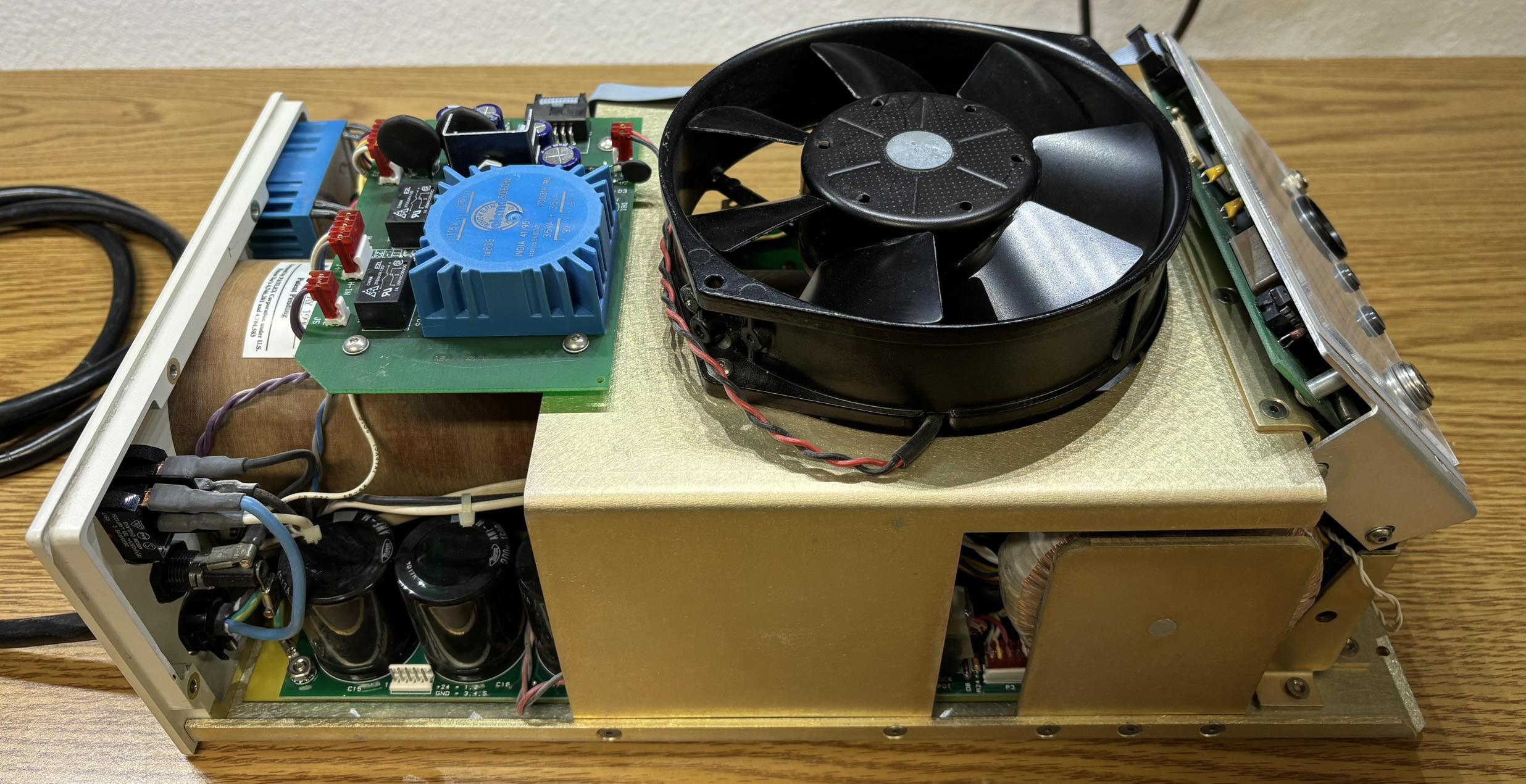 This side view shows a strange design feature of the AccuCure 3000. There is a circuit board mounted to the front heatsink, with a large diode sandwiched in between. Oddly, there is only one screw securing this entire board. We are not 100% sure whether this is factory design or a later modification. We believe it's factory as the board labels and overall design very closely match features of the main tube driver board. Likely due to impacts from shipping, this board rotated down towards the bottom, knocking off a thermal cutout switch that was glued to the front heatsink. There are two large (and heavy) ferrite beads on this board, making it even more susceptible to rotation. Adding a second fastener or a support bracket would have prevented this. Components also visible include some large capacitors and inductors on the bottom board for driving the tube. There is a potted power supply module mounted to the back case panel, which connects to the low-voltage distribution board mounted on top.